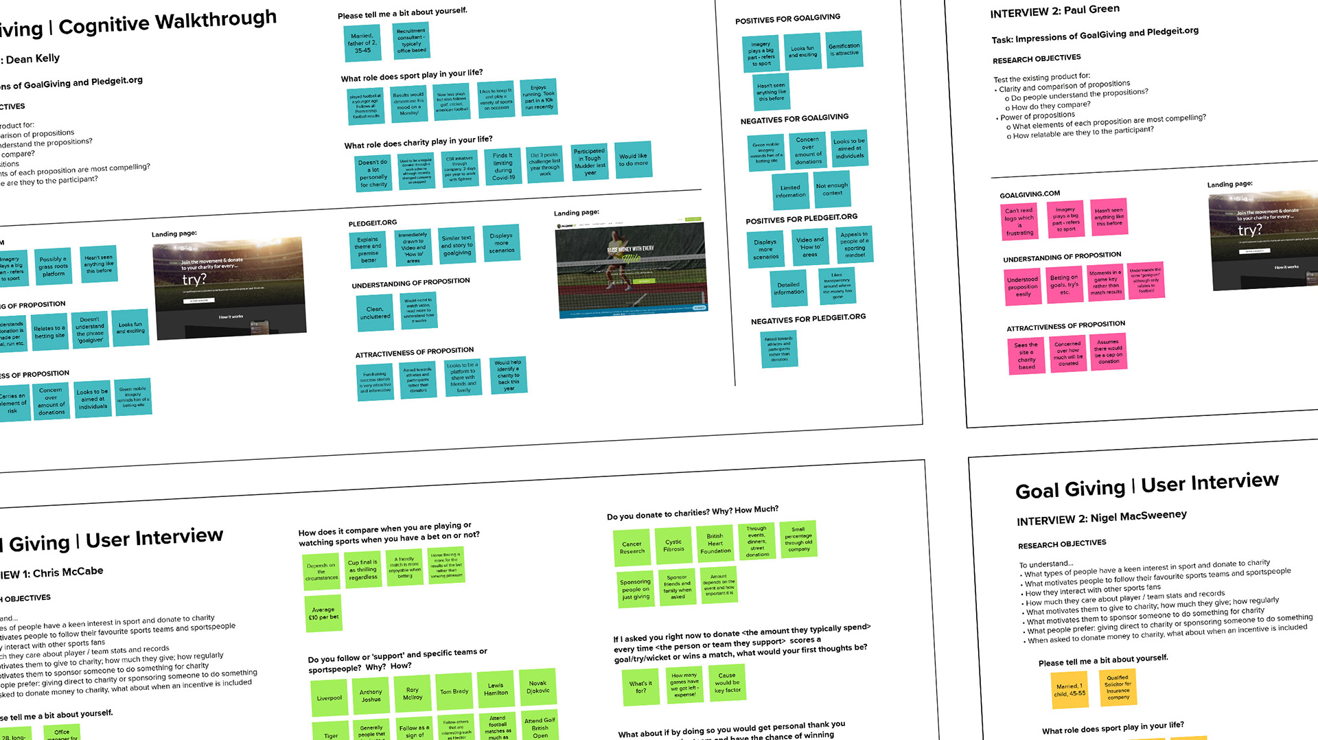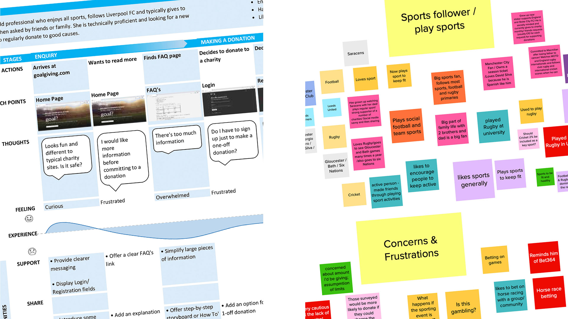 Adhering to the Double Diamond model, the initial phase of the project employed a range of user research tools and methodologies to better understand Goalgiving’s audience and their motivations.