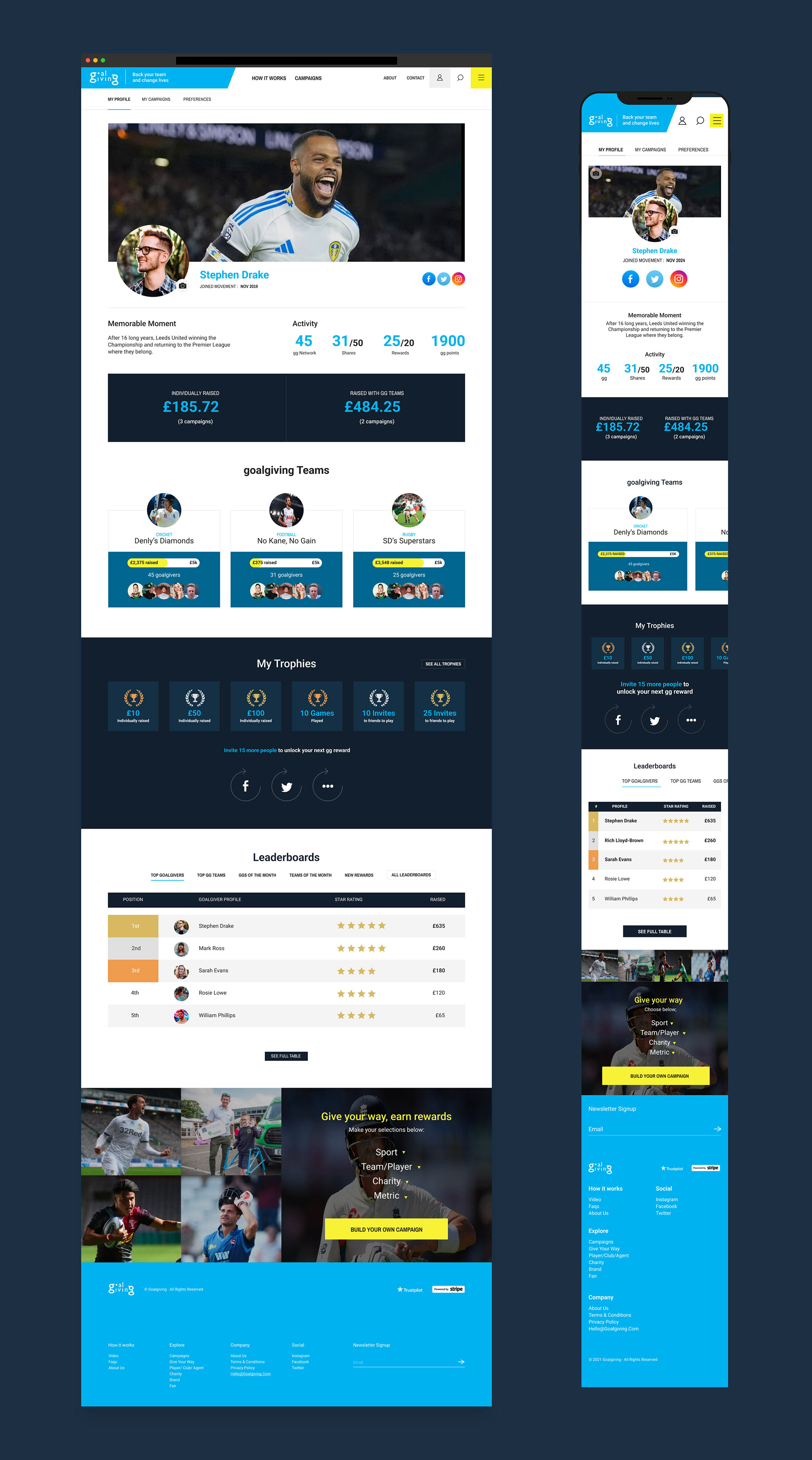 A priority area was the donation process, where I streamlined the checkout flow by reducing unnecessary steps and improving clarity to help users donate quickly and with confidence. The resulting unified interface reinforced Goalgiving’s mission to make giving through sport simple, engaging and rewarding.