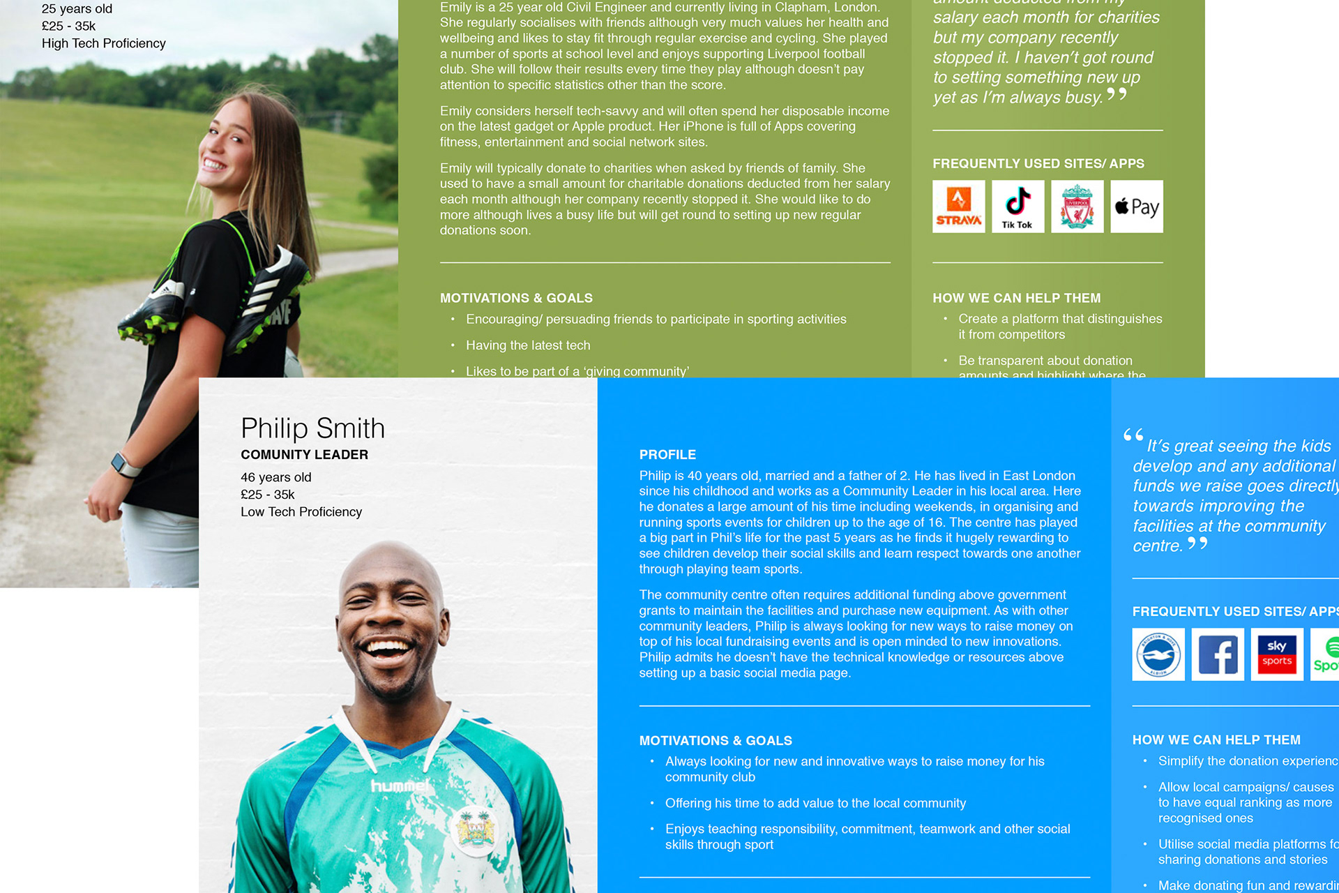 Building on the research insights, I developed user personas representing Goalgiving’s key audience groups, enabling me to make informed, user-centred design decisions and build empathy with the target users.